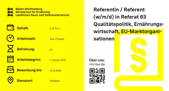 Beim Ministerium für Ernährung, Ländlichen Raum und Verbraucherschutz ist im Referat 63 – Qualitätspolitik, Ernährungswirtschaft, EU-Marktorganisationen – zum 1. Januar 2026 die Stelle einer Referentin / eines Referenten (w/m/d) befristet bis 31. Dezember 2026 zu besetzen. Die Stellenbesetzung erfolgt im Wege einer befristeten Neueinstellung oder im Rahmen einer Abordnung einer Arbeitnehmerin / eines Arbeitnehmers.