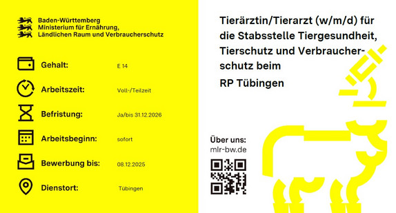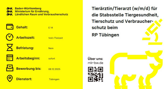 Beim Regierungspräsidium Tübingen ist in der Stabsstelle Tiergesundheit, Tierschutz und Verbraucherschutz (in den Sachgebieten Zentrale Koordinierungsstelle und Tierarzneimittelüberwachung) der Abteilung Landwirtschaft, Ländlicher Raum, Veterinär- und Lebensmittelwesen zum nächstmöglichen Zeitpunkt eine Vollzeitstelle mit einer Tierärztin / einem Tierarzt (w/m/d) zunächst befristet bis zum 31.12.2026 zu besetzen. Eine befristete Weiterbeschäftigung kann in Aussicht gestellt werden.