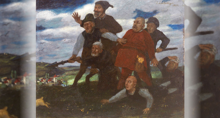 In Augsburg wollten sie sich Waffen besorgen, aber anstatt dass jeder sein eigenes Schwert getragen hätte, ließen sie sich einen einzigen gewaltigen Spieß machen, der sieben Mannslängen maß. „Wie alle sieben für einen, so für alle sieben nur einen!”, das war ihr Motto. So gerüstet zogen sie denn, einer hinter dem anderen an ihrem Wiesbaum schleppend, auf einigen Umwegen zum Bodensee.